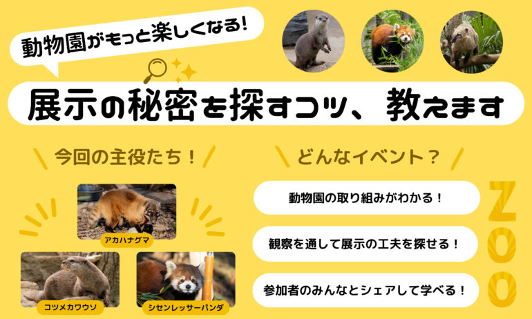 渡辺千絵, 橘百合子, 小山奈穂, 中山侑, 小倉匡俊. 動物園がもっと楽しくなる!展示の秘密を探すコツ、教えます. 2023年8月26日. 千葉市動物公園.